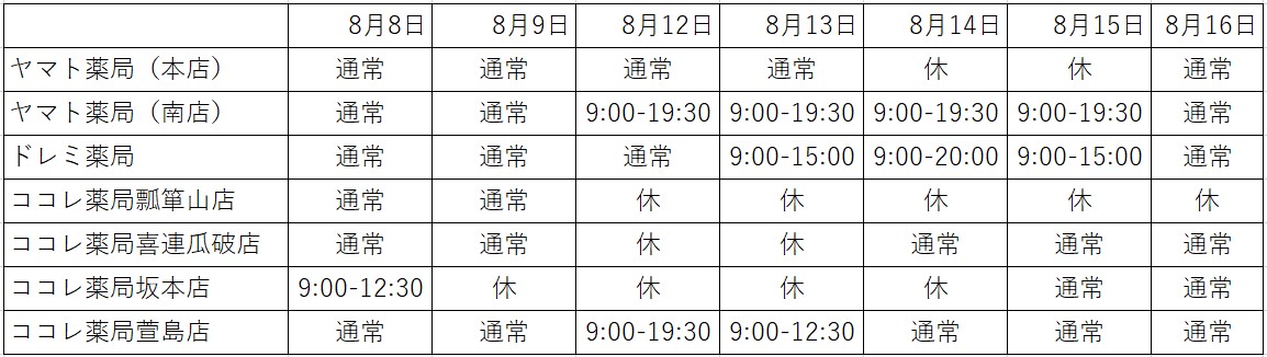 ・ヤマト薬局(本店):2025年8月14日(木)~8月15日(金)